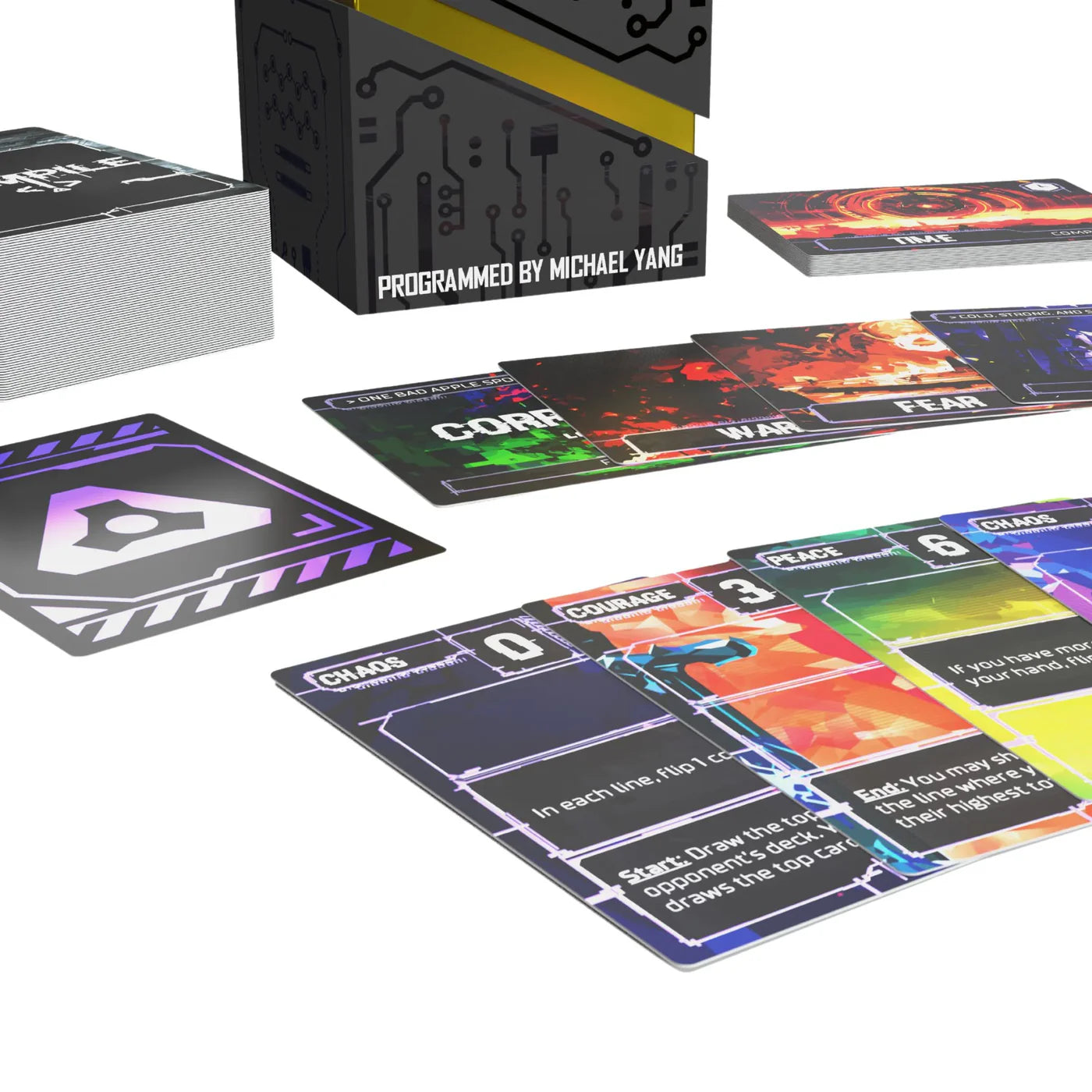 In the card game Compile, you are competing artificial intelligences trying to understand the world around you. Two players select three Protocols each to test. Concepts ranging from Chaos to Mirror are pitted against each other to reach ultimate understanding. Play cards into your Protocols' command lines to breach the threshold and defeat your opponent to Compile. First to Compile all three Protocols grasps those concepts to win the game.