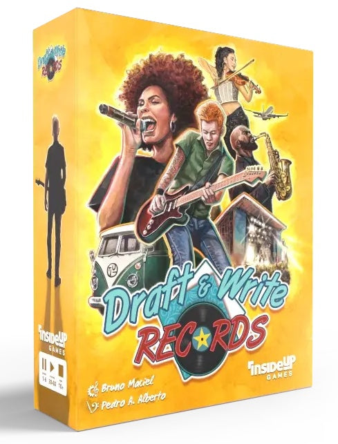 In Draft & Write Records, players draft cards simultaneously to take actions in hopes of hitting the big time. Strategically recruit crew members to your band to create harmony, triggering bonus actions such as going on tour or releasing albums. Complete goals to earn extra Star Power and outperform the competition.