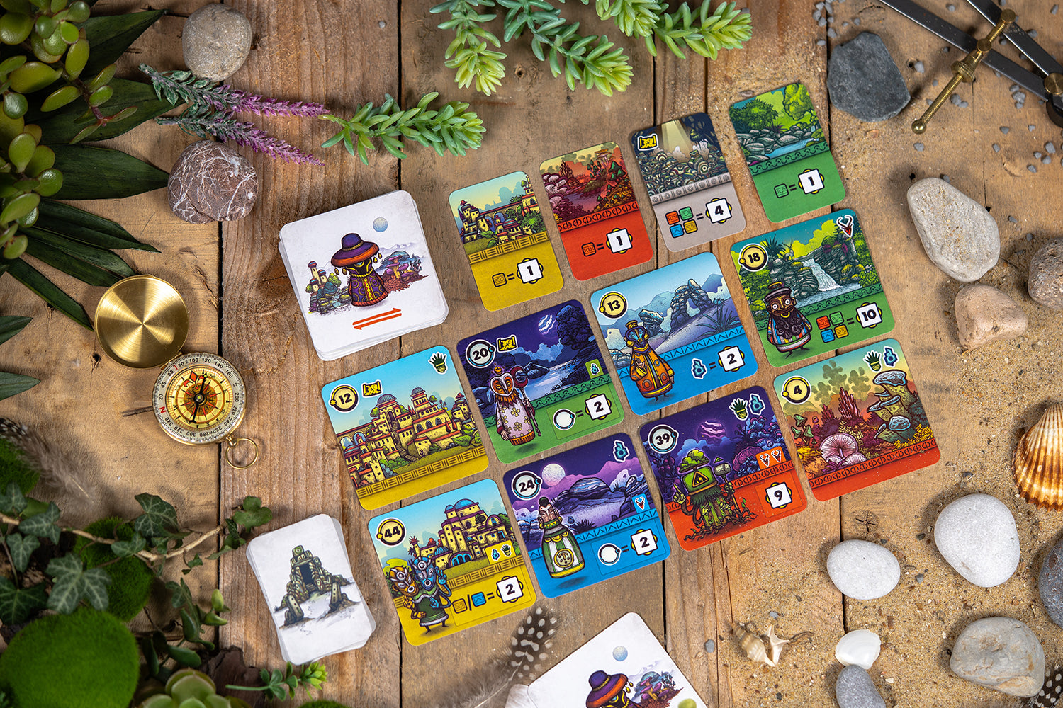 Make a table of 8 cards, from left to right. Each gives you objectives and the means to achieve the others. Think carefully about the construction of your table because the scoring is done in the opposite direction to the order in which the cards are placed.