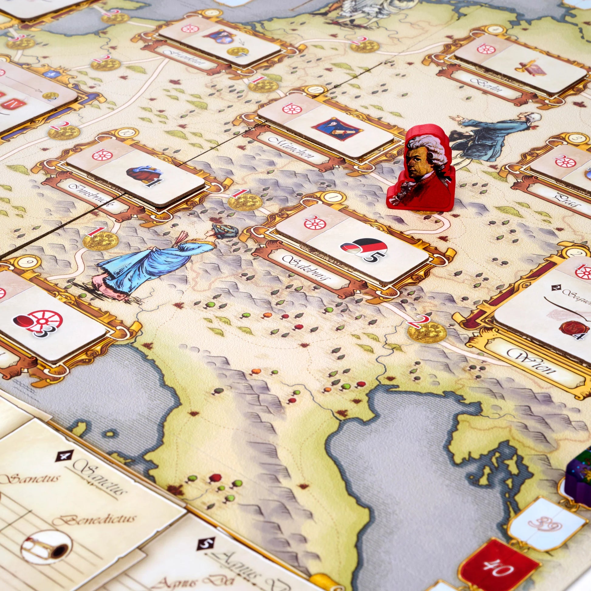 In Lacrimosa, players take the roles of patrons of the late musician, contributing with their fundings to the composer’s works one last time. During the game, you play in two different timelines: the present and the past. In the present, you commission the missing parts of the Requiem from other composers in order to complete it. When developing past events, the game takes place in five epochs in which you contribute by buying new compositions from the composer to sell or exhibit, accompany him on the different journeys through the main courts and theaters in Europe, and gather the resources you need in order to support the musician during his career.