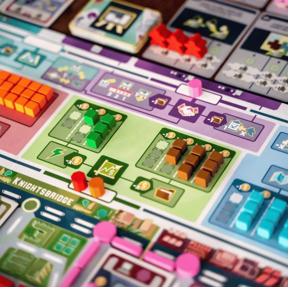 While the economy shifts and resources become more scarce, players must try to outwit each other and earn prestige by fulfilling public project objectives and their own private agendas.