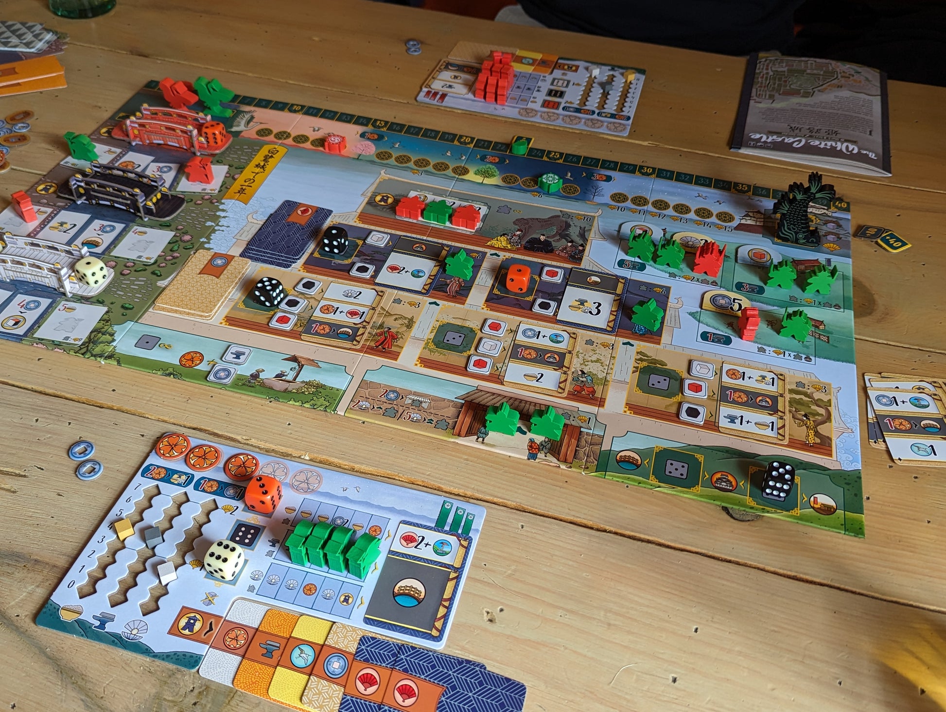 The central panel shows Himeji Castle in all its splendor, divided into several zones. The largest is inside the castle, with the Room of the Thousand Carpets, where the courtiers must ascend socially until they reach the circle closest to the Daimio to enjoy his favor. There is also the pond and the gardens, patiently tended by the gardeners where everyone can relax and contemplate its beauty without restriction. Another important area is the wall and the outside of the castle, where the warriors patrol and stand guard. Finally, we find the area of the three bridges, where the three types of dice that can be used to carry out actions are accumulated, and the personal domain of each player, where they will keep track of their resources and where they will have a reserve of workers.
