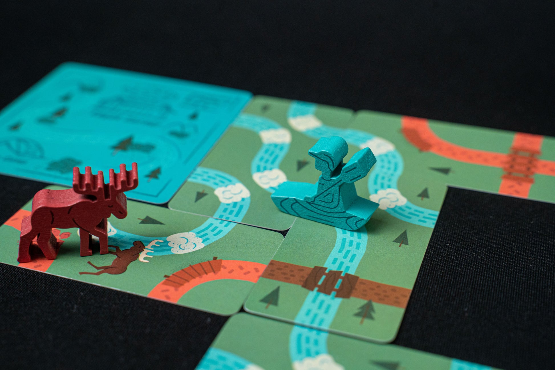 In Trailblazers players compete to earn the most points by building hiking, biking, and kayaking loops from their campsites of the matching trail type. Each round, players are dealt eight trail cards where they’ll draft two cards, arrange those cards in their personal area, and pass their hand to the next player three times. Cards must either be placed adjacent to or overlapping other cards. While players can push their luck by aiming to construct long and elaborate trails, only closed loops that start and end at a matching campsite will score points. Players also compete to fulfill “First To” and “End Game” goal cards. After four rounds, the game ends and the player with the most points from closed loops and goal cards wins.